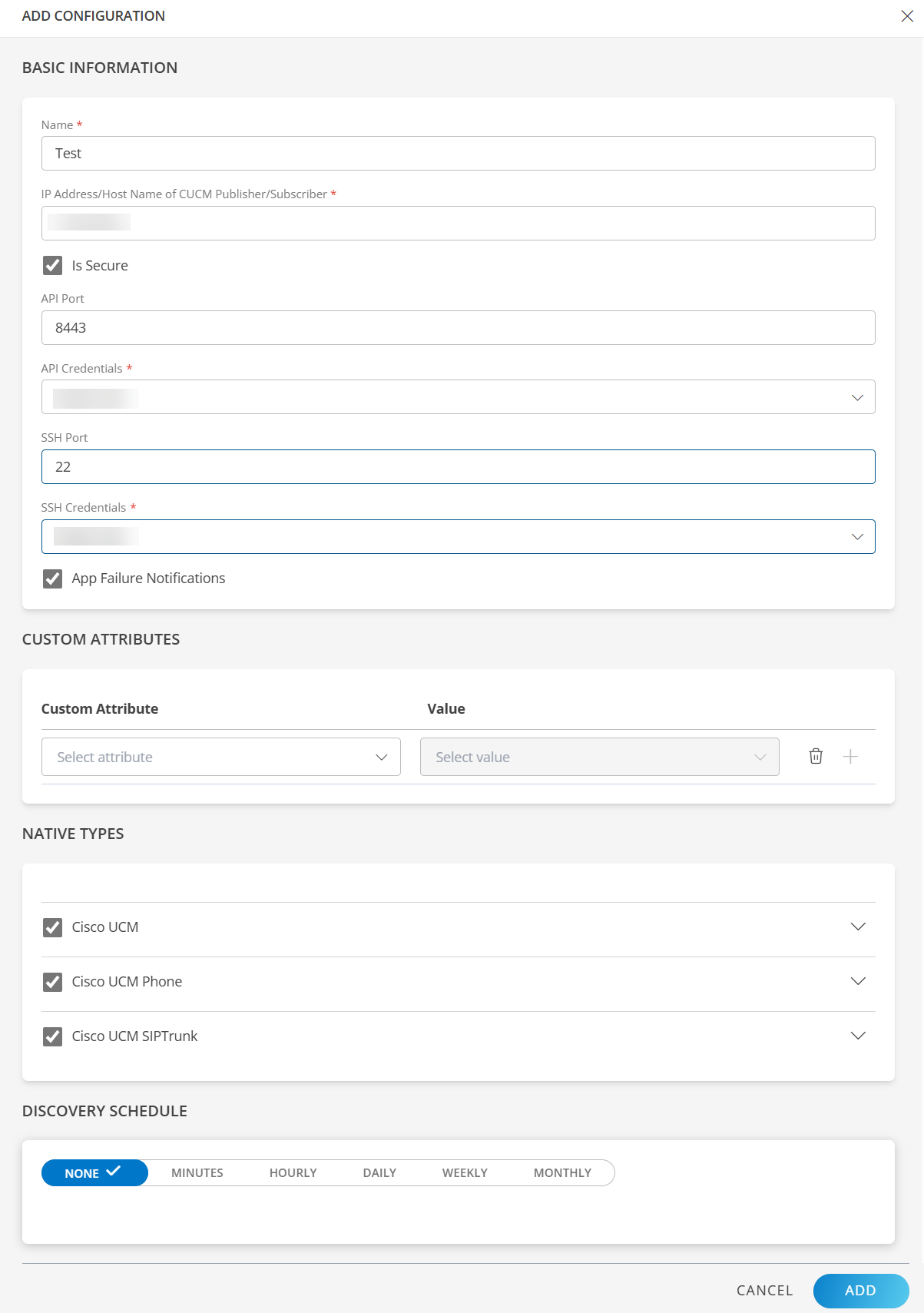 | SSH Credentials | Select or create the appropriate Cisco UCM Publisher or Subscriber SSH credentials. Else click +ADD to create credentials. In the ADD CREDENTIAL window enter the following: